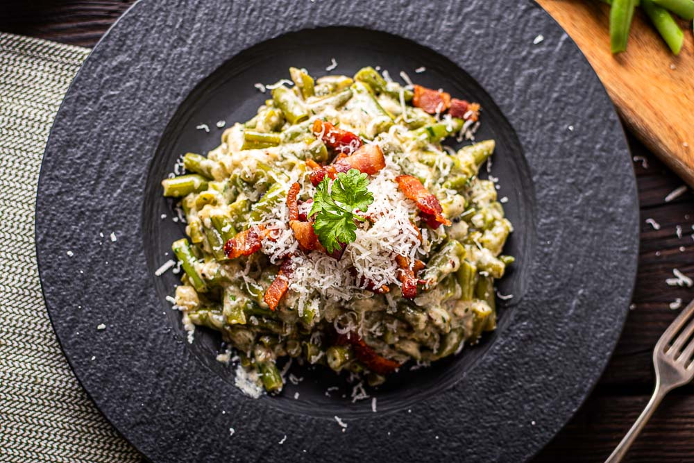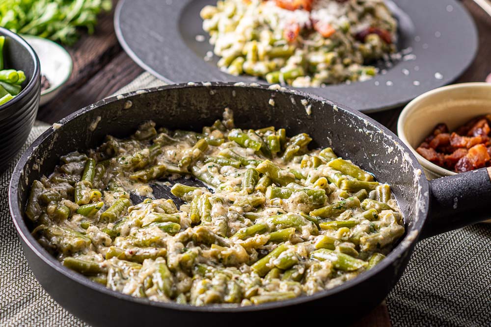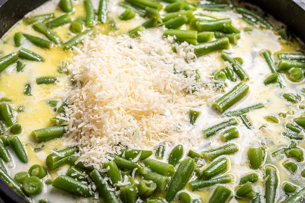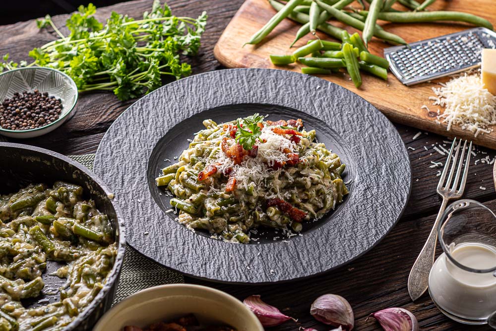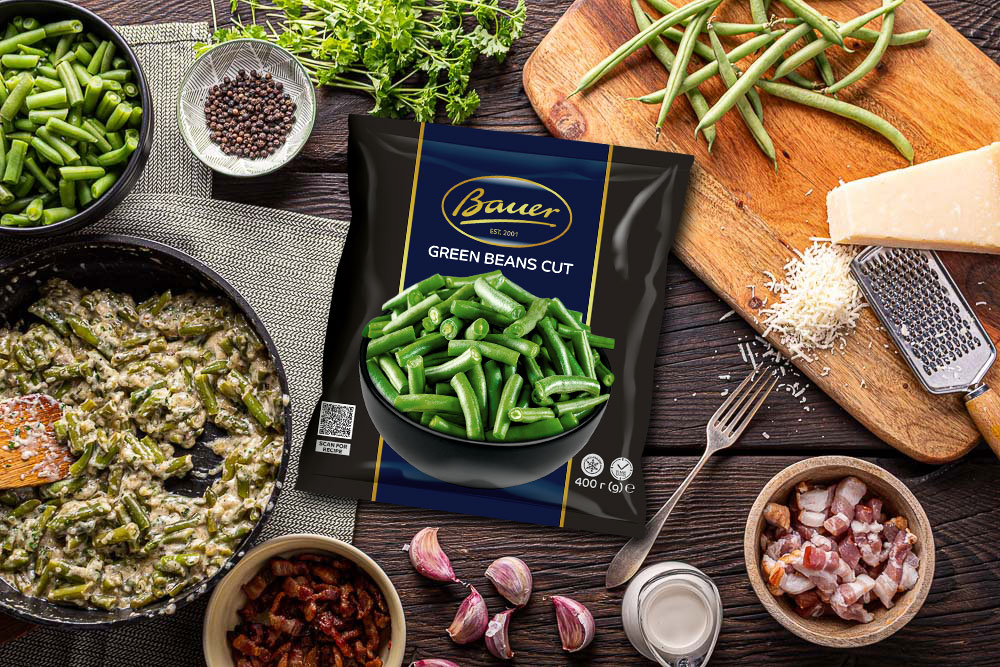 Cut the bacon into pieces and place it in a cold pan, then turn on the stove to low heat, allowing the fat to render slowly without burning the bacon. Fry until golden, then remove it with a slotted spoon. In the same pan, using the rendered bacon fat, add the chopped garlic and fry for about 10–15 seconds until it turns lightly golden. Next, add the Bauer green beans and stir well, ensuring they are evenly coated with the bacon fat and garlic. Pour in the broth, stir, and bring to a boil. Let it cook, stirring occasionally, until the beans are tender and some of the liquid has evaporated. Once the broth has reduced, add the heavy cream, Parmesan cheese, and black pepper. Stir everything together and bring it back to a boil, then lower the heat to medium-low and let it simmer for about two minutes until the sauce thickens slightly. If you prefer a thicker consistency, mix half a tablespoon of potato starch with a little water and add it to the sauce, stirring well. Finally, add freshly chopped parsley and combine everything thoroughly. Serve the green beans on a plate, topped with the crispy bacon and an extra sprinkle of grated Parmesan. Enjoy your meal! 😊