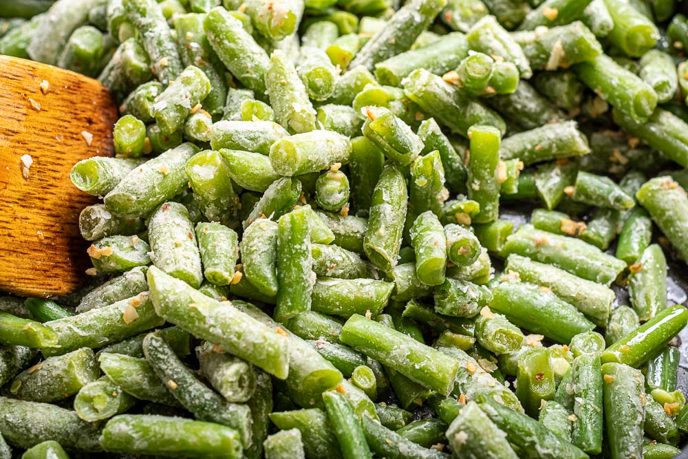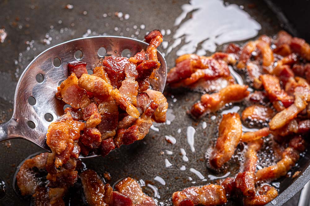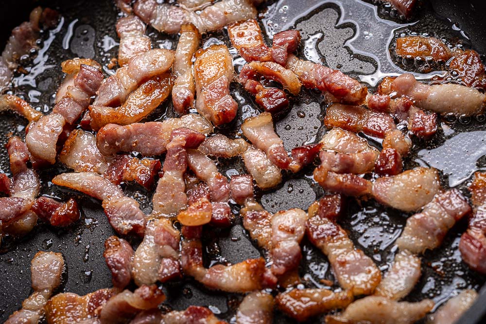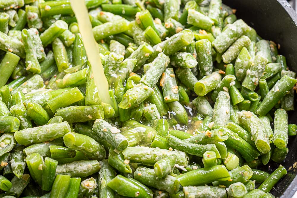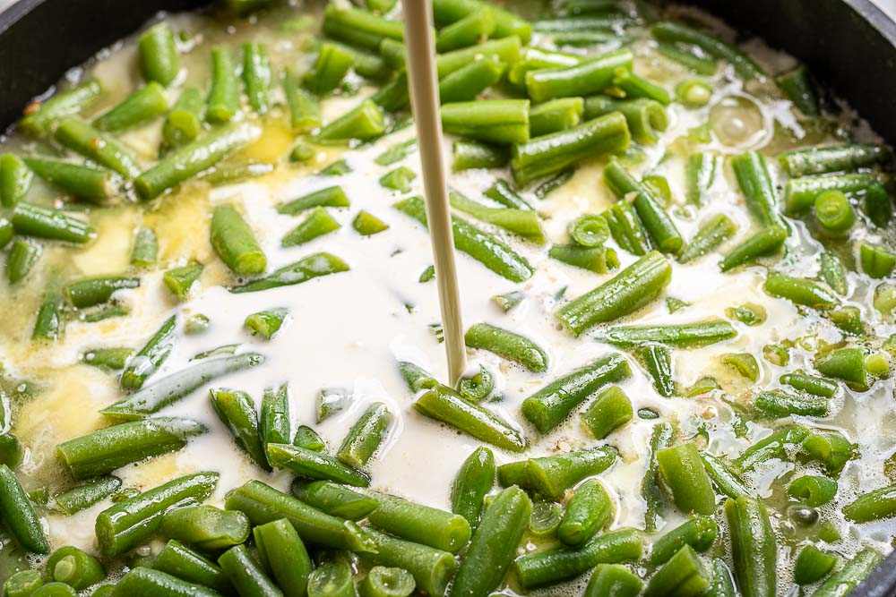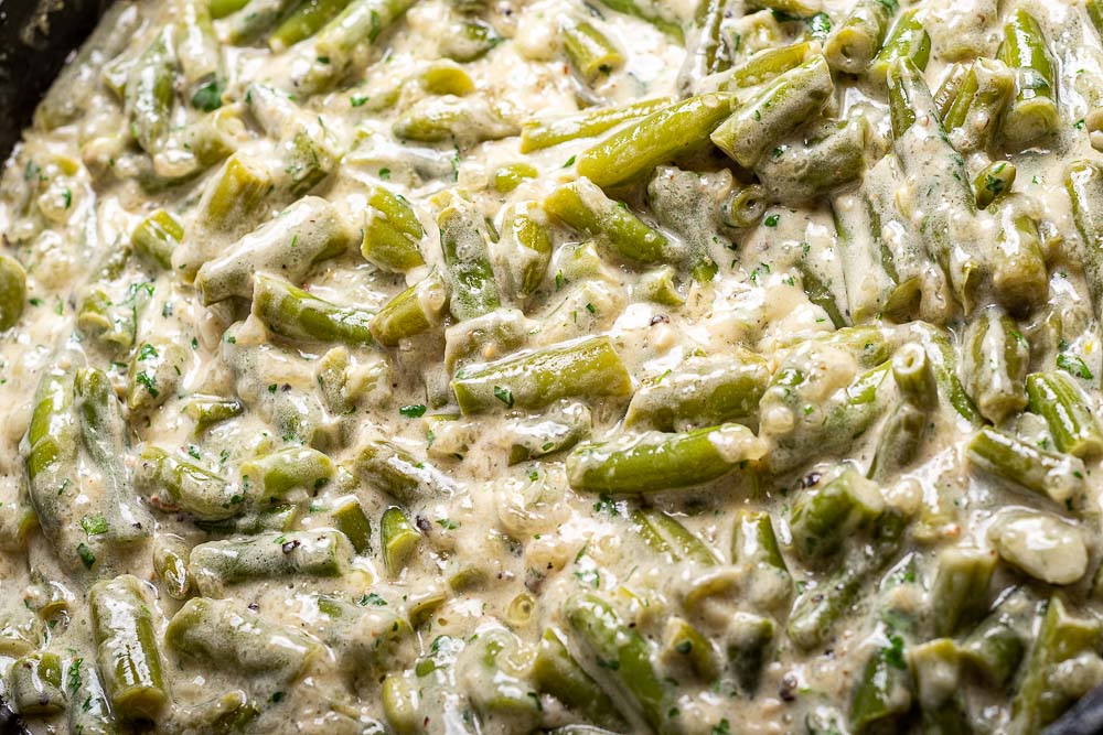 Cut the bacon into pieces and place it in a cold pan, then turn on the stove to low heat, allowing the fat to render slowly without burning the bacon. Fry until golden, then remove it with a slotted spoon. In the same pan, using the rendered bacon fat, add the chopped garlic and fry for about 10–15 seconds until it turns lightly golden. Next, add the Bauer green beans and stir well, ensuring they are evenly coated with the bacon fat and garlic. Pour in the broth, stir, and bring to a boil. Let it cook, stirring occasionally, until the beans are tender and some of the liquid has evaporated. Once the broth has reduced, add the heavy cream, Parmesan cheese, and black pepper. Stir everything together and bring it back to a boil, then lower the heat to medium-low and let it simmer for about two minutes until the sauce thickens slightly. If you prefer a thicker consistency, mix half a tablespoon of potato starch with a little water and add it to the sauce, stirring well. Finally, add freshly chopped parsley and combine everything thoroughly. Serve the green beans on a plate, topped with the crispy bacon and an extra sprinkle of grated Parmesan. Enjoy your meal! 😊